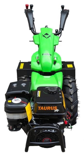 Le Pro Taurus est un motoculteur multifonctions qui vous permettra de labourer, fraiser, ou bien encore refaire vos pelouses avec une grande facilité. Son puissant moteur OHV de 420 cm3 – 13 CV et ses imposantes roues agricoles en 500 X10 viendront à bout des travaux de labourage et de maraîchage les plus lourds. Le Pro Taurus dispose d’un guidon réglable en hauteur et en déport qui pivote à 180° pour une grande souplesse d’utilisation. Il est également équipé d’un embrayage double cône à ressort et d’un blocage différentiel. Démarrage électrique à clés et manuel par lanceur. 3 vitesses avant et 2 vitesses arrières Grâce à sa prise de force indépendante, vous pourrez couplez à ce dernier des accessoires optionnels tels que par exemple, des charrues, balayeuses, débroussailleurs, broyeurs, chasse-neige, tondeuses, etc. . Caractéristiques techniques : Moteur LONCIN OHV 4 temps – 13 cv – 420 cm3 – Norme EURO 5 Module rotovator de 65 cm de largeur réductible à 50 cm ou avec supplément 80 cm réductible à 60 cm (sélectionner version dans menu déroulant) Carburant: Sans plomb 95 Démarrage électrique et manuel par lanceur (batterie fournie) Nombre de vitesses : 3 avant + 2 arrière Guidon réversible à 180° Filtre à air à bain d’huile Roues 5.00-10 Embrayage double cône avec ressort Transmission par engrenages Blocage différentiel Poids 137 kg Garantie 2 ans Pièces détachées disponibles pendant 10 ans Assistance téléphonique de mise en route avec notre technicien – Notice de montage et d’utilisation en Français Livraison gratuite Recommandations huiles : Huile moteur synthétique multigrade SAE 10W/40 ou SAE 15W/40 ou SAE 20W-50 (A vérifier toutes les 50h). Filtre à bain d’huile, rajouter la même huile moteur jusqu’au repère du réservoir (environ 1 cm) Boîte de vitesse : Les motoculteurs ont déjà le plein d’huile boite, prévoir tout de même pour l’appoint de l’huile pour engrenages SAE 80W/90.